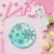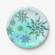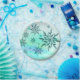 Blue and silver snowflakes riding on a turquoise and blue swirly winter breeze. Set on a white background. Fun and delicate design.