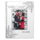 The elegant Snowflake Winter Wedding Photo Spiral Notebook can be personalised with the names of the bride and groom, their December, January or February marriage ceremony date and photograph. Create a custom planner, guest book or advice book. This customised wintery nuptial note book features silver grey tone intricate snowflakes adorning the corners with a white background.