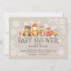 Cute winter wonderland baby shower invitation featuring an adorable bunny, bear, moose, deer, fox & racoon set on a light tan snowflake background for a geneder neutral shower.
