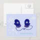 A cute design for the winter weather. A soft blue background with white snowflakes floating about. The words winter wishes in soft blue. A royal blue pair of mittens with a snowflake design in the centre.