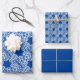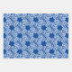 Holiday gift wrap featuring snowflakes and stars on blue.