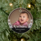 This keepsake Christmas ornament features a photo of baby and is framed with the color black and white snowflakes. White script text reads: My First Christmas. Additional custom text allows you to personalize with baby's name and year.