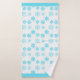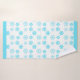 Turquoise blue and white bath towel set with snowflakes on the hand towel and bath towels. The wash cloth is done in a solid turquoise blue with custom white text reading Let it snow.