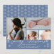 Holiday Christmas baby announcement in blue. The card is decorated with hand-drawn Christmas trees and snowflakes. This birth announcement is simple and yet elegant; it is perfect for the arrival of your little bundle of joy. Images by Irina Murza, Fe Ngo, and Kelly Sikkema