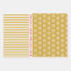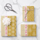 Snowflakes, Christmas trees and stripes gold Wrapping Paper Sheets with red Christmas wishes. One sheet displays a cute pattern of snowflakes and stripes on gold. The second features snow and the third white trees. There also is the text "Merry Christmas" in red on all sheets. Personalise it with your text.