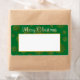 Christmas shipping labels with gold snowflakes on green. “Merry Christmas” text in white across the top is easy to change to your preferred greeting. A white panel is provided to either print or hand-write mailing addresses.