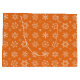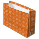 Christmas gift bag with white crystalline snowflakes against a burnt orange background.