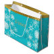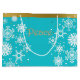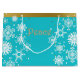 Elegant holiday gift bag done in robin's egg blue, with a gold border, around the top of the bag. Graphics of white snowflakes and gold dots, decorate both sides of the bag, with gold tone graphic text reading Peace. Customise to add your own text to this lovely holiday bag.