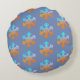 Blue and orange snowflakes on a round cushion.