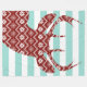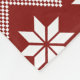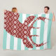 A blanket featuring a red deer with white snowflake and zigzag pattern over a blue and white striped background.