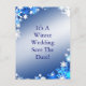 A sprinkling of pretty blue snowflakes frame the type on this postcard making it perfect for the winter wedding. This save the date is part of a full wedding line; however, if additional pieces are needed just let us know.