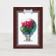 Original graphic artwork of a snow globe with a potted pink poinsettia inside and lots of snow. A beautiful deep red baroque style design, with satin looking white bow frames this elegant Holiday greeting card.