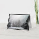 Beautiful photograph of a snowy black and white landscape makes the perfect Christmas greeting card. A black and white frame adds a nice touch, and graphics of white snowflakes decorate the left side of the photograph. Customise the text to your needs.