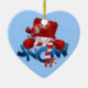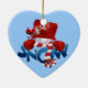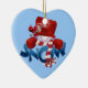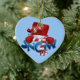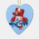 A snowman with red mittens and a red and white hearts hat enjoys the day with his friend the red cardinal and text reads "SNOW" on a porcelain Snowman and Cardinal holiday keepsake ornament.