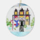 Spread gladness with this snowman and candy cane in front of this fun snow dusted holiday house with trees and even a wreath on the door. A whimsical design for the tree. Customise as desired.