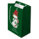 This cute santa claus and snowman gift bag will please kids of all ages! The front of the bag has a cute cartoon portrait of Santa Claus, with the stylised text in light gold that says "Merry Christmas". The back of the bag (shown) has an adorable snowman carrying a red and white striped candy cane which is tied with a pretty green bow. At the bottom are two text fields for your personal message. The images and text are placed on a dark holiday green background. Cute!