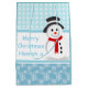 Cute snowman and snowflake design on blue and white personalised Christmas gift bags. Customise with your own text. Image and text on front and back.