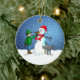 The boy has built a snowman that his dog stands and urinates on while the boy gives the snowman a carrot nose.
