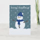 A Christmas card featuring a cute snowman in a blue hat and scarf with a background of snowflakes. Message inside reads 'And a Happy New Year'.