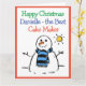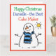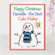 Happy Christmas to a Cake Maker. Funny cartoon of a snowman in the winter sun. Add a message from the sender.
