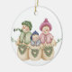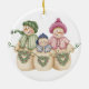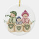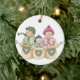 A snowman family with heart shaped wreaths on a porcelain ornament sure to delight anyone who loves snowmen and winter!