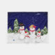 A Snowman and his family are in the frosty snow watching the shooting stars. A baby bunny plays while a Red bird sits on Momma Snow's hat and a Bluebird eats some seeds.