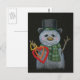 Winter Snowman holding Heart Rings Postcard. Fun card for Valentine's Day or just sending greetings from the north in the wintertime.