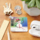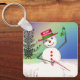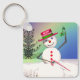 Keychain with my 3d artwork of a smiling snowman holding mistletoe and a candy cane and wearing a red hat that says "Merry Christmas".
