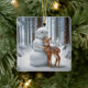 A whimsical scene in a snow-covered forest features a friendly snowman with a carrot nose and a young deer nuzzling against it.