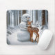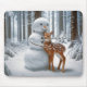 A whimsical scene in a snow-covered forest features a friendly snowman with a carrot nose and a fawn nuzzling against it.