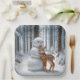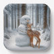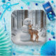 A whimsical scene in a snow-covered forest features a friendly snowman with a carrot nose and a fawn nuzzling against it.