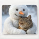 A snowman with a carrot nose holds a contented tabby cat against a snowy backdrop, where the cat has its eyes closed, seemingly enjoying the embrace