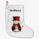 This Christmas stocking features a cute snowman in a deep red velvet cape and top hat. The name text is customisable.