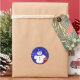 A little snowman dressed in a blue hat and scarf ready for the cool weather. He's holding a red bucket with Christmas tree design on it, full of holiday treats.