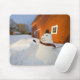 Snowman in front of red barn in Columbia Falls Mouse Pad