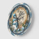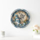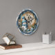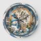 This image features a circular wall clock with a charming, rustic winter scene. The central design displays a smiling snowman wearing a blue striped hat and scarf. The background is a vertical wood plank sign that reads "let it snow". The scene includes various elements of winter foliage, blue berries, pine needles, and large snowflakes. The clock face is surrounded by a decorative border of blue, white, and tan stripes. The overall color palette is dominated by various shades of blue and brown.
