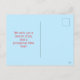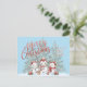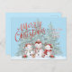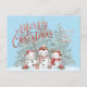 Send a postcard with a winter wonderland of Christmas cheer! This holiday postcard features 3 festively dressed snowmen with evergreen trees and snowy in the background. There is a family name template on the front for you to customize. The back of the postcard features a blue background with a message template to send a wish with your cards.