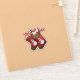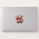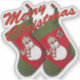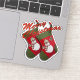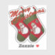 This Christmas sticker design features a duplicate photograph of a red and green stocking with an adorable snowman dressed with a seasonal plaid scarf and hat.
