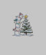 A whimsical illustration featuring three snowmen stacked in a playful pyramid. The bottom snowman supports the other two, while the top snowman carefully places a golden star atop a snow-laden Christmas tree. Each snowman wears a colourful winter hat and scarf, with snow gently falling around them, creating a festive and cheerful holiday atmosphere.