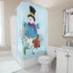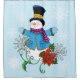 A charming snowman, warmly dressed in a bright blue coat and light blue mittens, arms open wide as if inviting you to share in the joy of the season. Topping off the look is a classic black top hat. Beside the snowman, two large snowflakes and a vibrant red poinsettia that brings a festive pop of colour. All set against a soft light blue backdrop