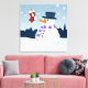 Snowman illustration in a Christmas scene with his own personal stocking pegged and hanging from a washing line.