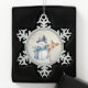 "Snowman Surrounded in Holly" with a Fawn Snowflake Pewter Christmas Ornament. Celebrate the holiday spirit with this charming snowman and deer ornament, perfect for adding a touch of whimsy to your Christmas tree. Crafted from durable pewter, this delightful piece features a snowman adorned with holly and a sweet deer fawn peeking over his shoulder, all elegantly shaped like a snowflake. The ornament is finished with a lovely silver braided ribbon, making it a beautiful addition to your festive decor. Pair it with our coordinating Christmas Tree Skirt and 3 Canvas Holiday Print on a Wooden Ledge for a complete holiday look, or gift it to a loved one to spread the joy of the season.