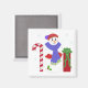 A scene with a snowman leaning against a candy cane and a tall red gift with a big green bow beside him. A cute Christmas design.