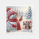A cheerful snowman wearing a red hat and scarf holds an ice cream cone with a dog looking at it sitting in deep snow