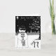 The christmas star is twinkling in the night sky and the snow has fallen covering the nearby tree in a little piles of snow. This cute smiling snowman is looking at his stripy Christmas stocking, which is hanging on a nearby twig, hoping for Santa to drop by and fill it up with lots of special Christmas gifts. The happy snowman is wearing a black hat and a striped scarf. I think this black and white illustration of a snowman on this christmas art card will bring seasonal cheer during the festive holiday period. This is a customisable christmas note card, you can personalise it with your own message on the front and inside. The original black and white snowman illustration was drawn in pen and ink. Happy Christmas!
