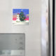 A Christmas magnet with a snowman decorating a Christmas tree.