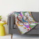 A quality printed throw has its advantages. This is a much finer weave throw than its loopier cousins, and though lighter, it is worth the investment for custom room accessorizing. The back is much prettier than the typical brown, and the fringe on the long sides very vivid, the selvage nicely done. Before photographing, I washed the throw in cold water, delicate, with a thicker woven throw the same size. On tumble dry low, this throw was dry in half the time as the other. This is a very practical quality if you use throws for furniture covers or to wrap up in frequently. The sleekness of the fabric makes it a great layer for accenting or protecting without the feeling of sitting on too much stuff. Perfect for napping or when you feel a light chill coming on. The color printing is beautiful and on this fabric, matched the design and color of my Photoshop image. This is an advantage for blending room fabrics and colors. The fringe on the short sides prints the colors from the design image and therefore varies from the side fringe. I streaked a white fractal line through the plaid pattern to give the illusion of weaving. This printed as crisp as an illusory thread, and put some white in the short side fringe, showing another advantage of print vs loomed- for artistic purposes, line lines, detail, and color integrity can be planned and preserved. My loomed throws have color limitations and more of a needlepoint texture. Print throws reproduce an exact image. The throw felt a little stiff straight out of the package, but this went away in the first delicate wash. Of course I searched the wash water for ink or bleeding and there was none.