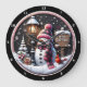 Step into a charming winter wonderland with this cheerful Christmas wall clock, designed to bring festive warmth to your home decor. The black clock face provides a striking backdrop for a happy snowman, adorned with a vibrant red scarf, standing proudly beside a classic lamppost. Delicate snowflakes drift in a serene snowfall, creating a cosy and magical frosty night scene. This decorative timepiece captures the joy of the holiday season and the spirit of Christmas Eve. A beautiful piece of wall art, its vintage style and cheery appeal make it a perfect gift, adding a unique and artistic touch to any room during the cold season.