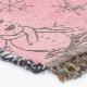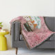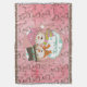 Pretty Christmas holiday throw blanket with a vintage pink background with little snowmen and snowflakes and a pink and white polka dotted circle with a snowman and snow lady dressed in top hats and winter hat and scarves with text that reads Let it Snow!