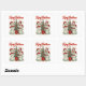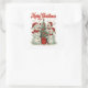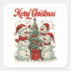 This charming sticker features three snowmen gathered around a decorated Christmas tree. They are all wearing Santa hats and red scarves, and are placing ornaments on the tree. A large red gift box with a bow sits at the base of the tree. The greeting "Merry Christmas" is written in red script above the scene. The design is set against a clean white background. The design may look real due to the high detail and three-dimensional texture in the artwork.